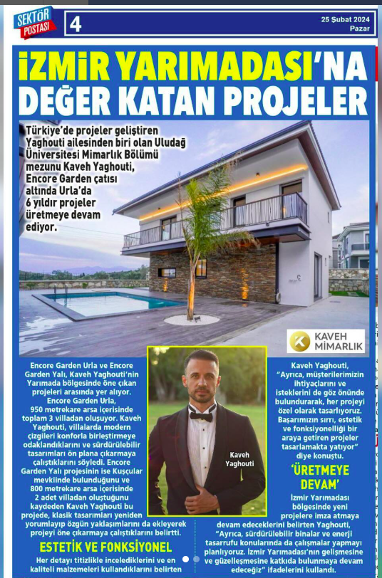 "İzmir Yarımadası bölgesine yeni projele imzası atmaya devam edeceklerini belirten Yaghouti, "Ayrıca, sürdürülebilir binalar ve enerji tasarrufu konularında da çalışmaya devam etmeyi planlıyoruz. İzmir Yarımadası'nın gelişmesine ve güzelleşmesine katkıda bulunmaya devam edeceğiz" ifadelerini kullandı."