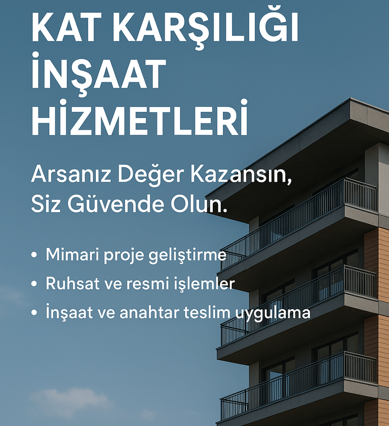 Kaveh Mimarlık olarak, yıllara dayanan deneyimimiz ve mimari vizyonumuzla arsanıza değer katıyor, sizin için en verimli çözümü sunuyoruz. Kat karşılığı inşaat modeliyle; arsanızın imar durumu, potansiyeli ve çevre dokusuna en uygun projeyi geliştiriyor, kaliteli ve estetik yapılar inşa ediyoruz.